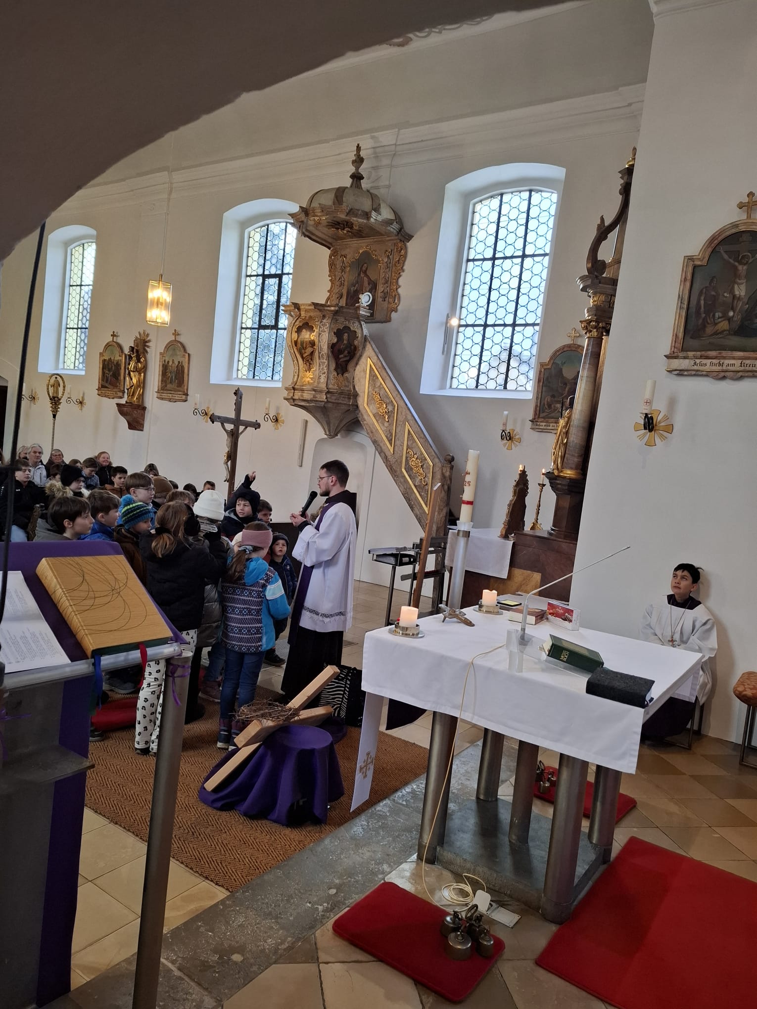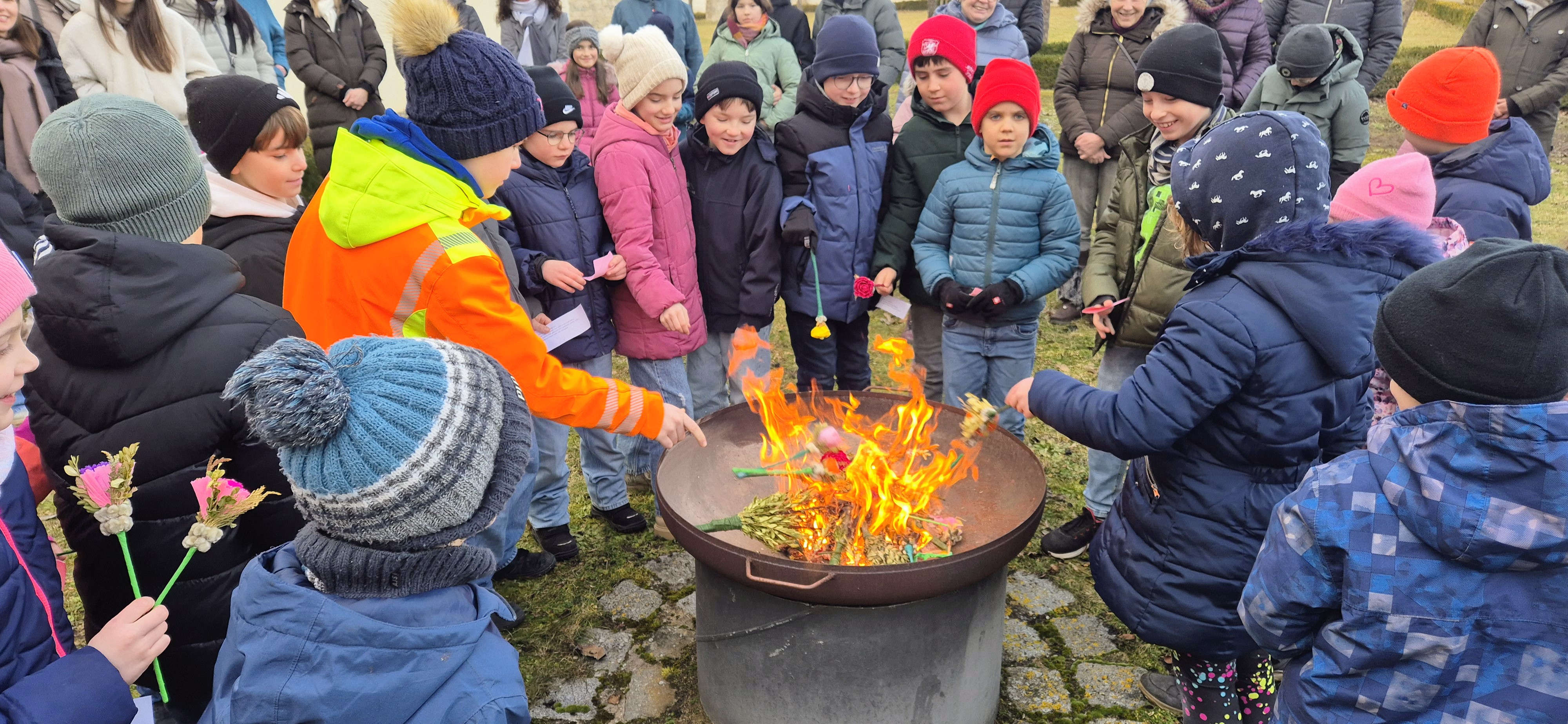 In einer Feuerschale verbrannten wir die alten Palmzweige. Aus der Asche wurde anschließend das Aschenkreuz ausgeteilt – ein besonderes Zeichen für einen Neubeginn und dafür, dass Gott uns begleitet. Die Kinder gestalteten den Gottesdienst aktiv mit: Sie lasen Texte vor und trugen damit zu einer lebendigen und feierlichen Atmosphäre bei.