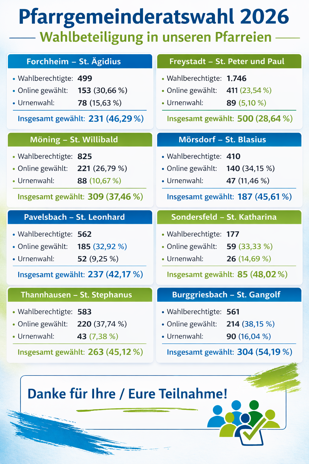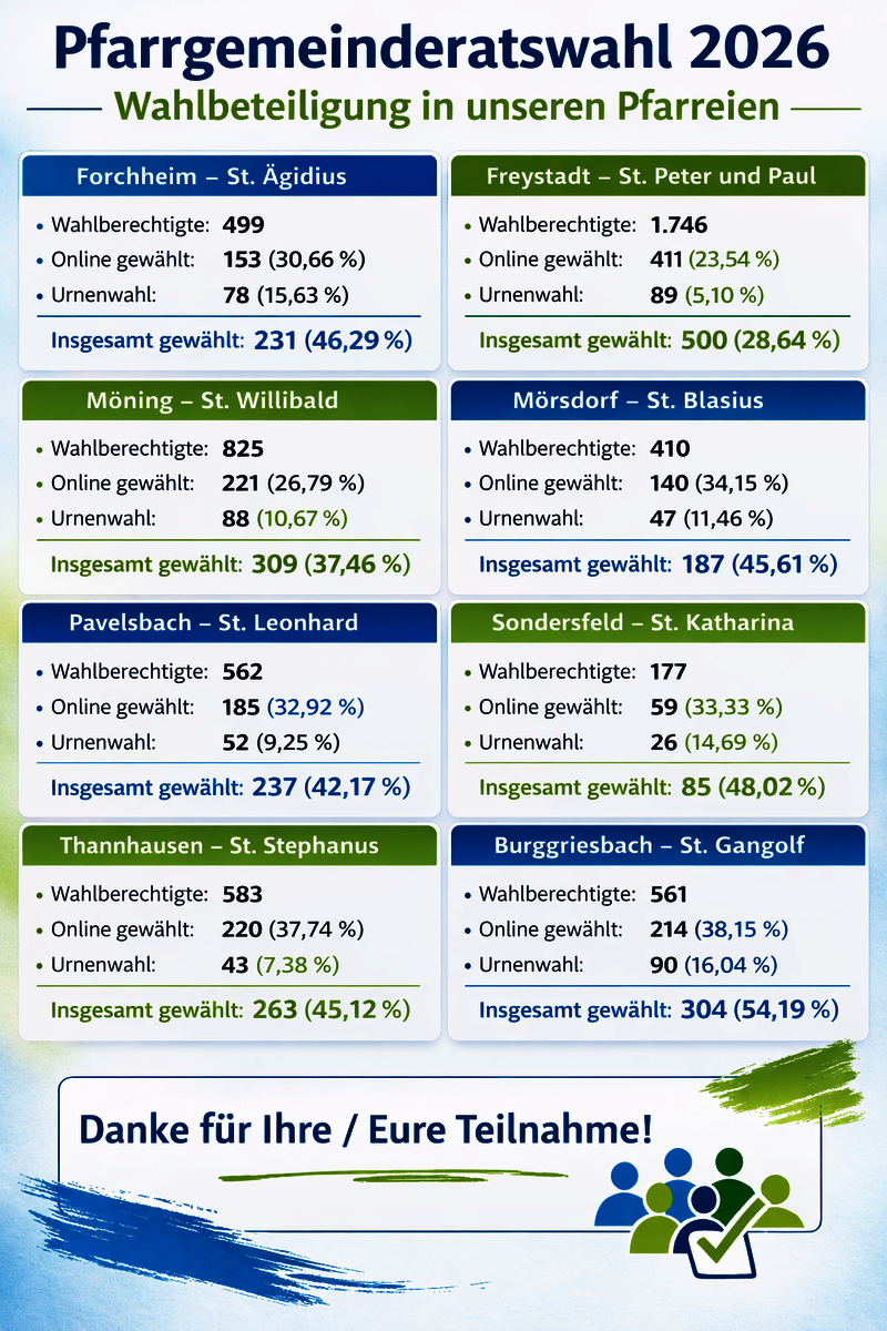 Ebenso danken wir allen, die ihre Stimme abgegeben haben, und natürlich allen, die gewählt wurden. Für die kommende Amtszeit wünschen wir Gottes Segen, Freude am Miteinander, gute Ideen und ein offenes Herz für die Menschen in unseren Pfarreien.