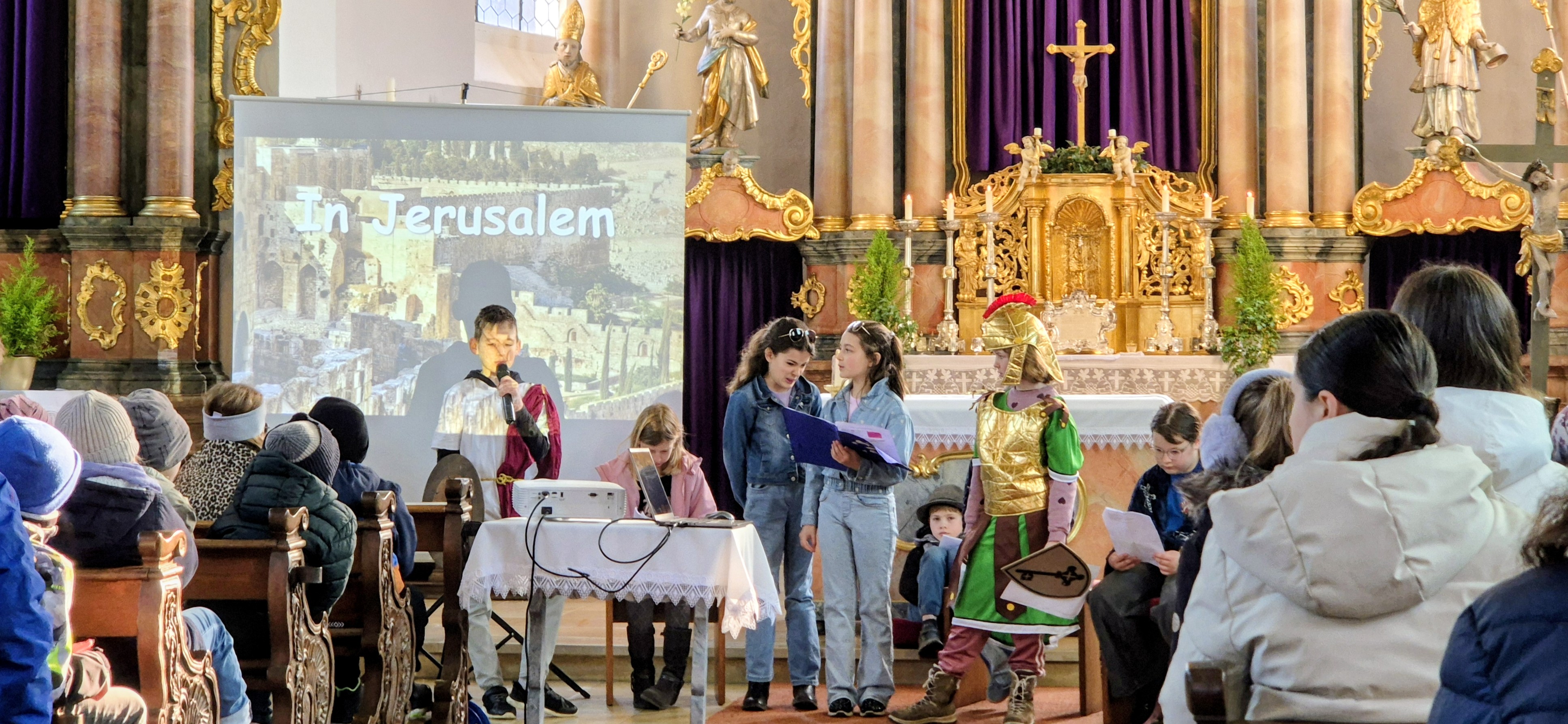 Im Mittelpunkt des Gottesdienstes stand die Zeit vor Ostern. Die Schüler erfuhren dabei auf anschauliche Weise, was damals in Jerusalem geschehen ist. Besonders lebendig wurde dies durch eine Gestaltung in Form einer journalistischen Befragung, die die Ereignisse für die Kinder verständlich und interessant machte.